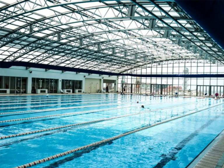 The new ‘skypool’ on the roof of Batumi Plaza features a retractable pool enclosure that opens up 45% and measures 117′ (34m) x 199′ (60.5m), and is 26′ (8m) tall at its highest point. It features glazed gable ends, one with operable folding doors, and bi-parting roof panels that open in good weather to let in sunshine and fresh air, and close on cold or rainy days to provide natural light in a protected environment.