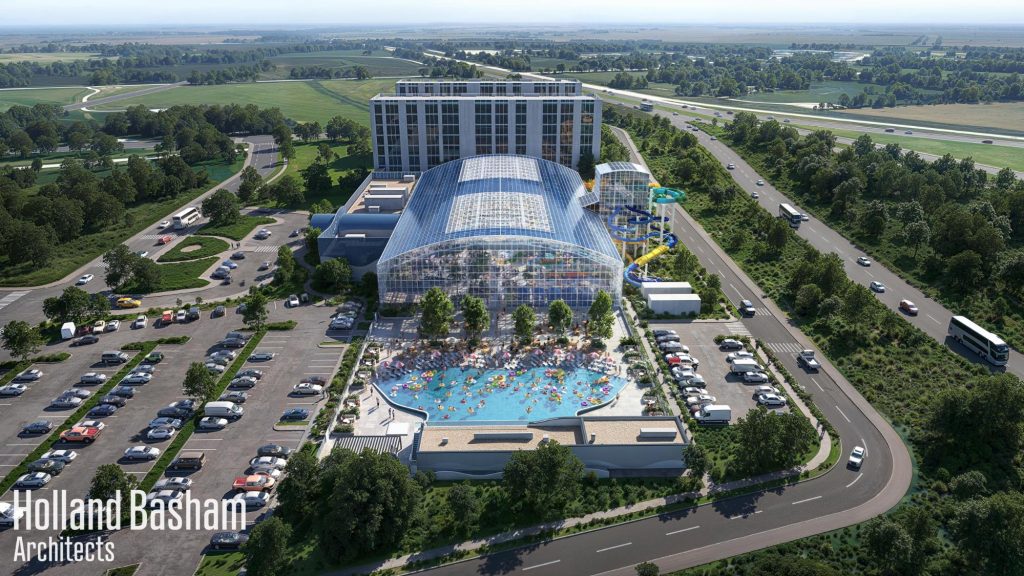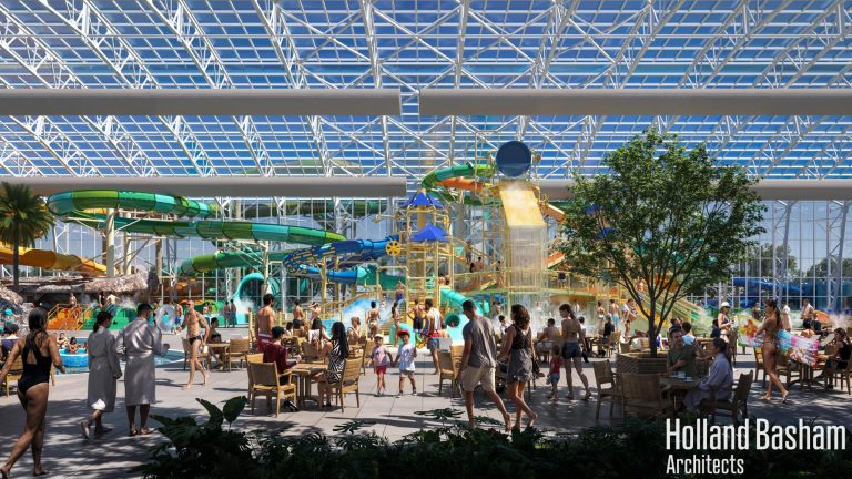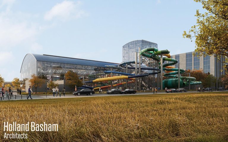The Bellevue Bay Indoor Waterpark is a proposed 140,000-square-foot indoor and outdoor waterpark in Bellevue, Nebraska. It’s the centerpiece of the 575-acre Bellevue Good Life District, near Highways 75 and 34, aimed at boosting tourism and economic growth. Key features include an OpenAire retractable roof, state-of-the-art water slides, a lazy river, and an interactive splash zone by Whitewater West, with connections to hotels, dining, and retail via a climate-controlled walkway. The project architects, Holland Bashamhave designed an exterior that celebrates the facility with a wavelike canopy welcoming visitors. Additional amenities like an arcade, gift shop and party rooms complete the entertainment for all ages.