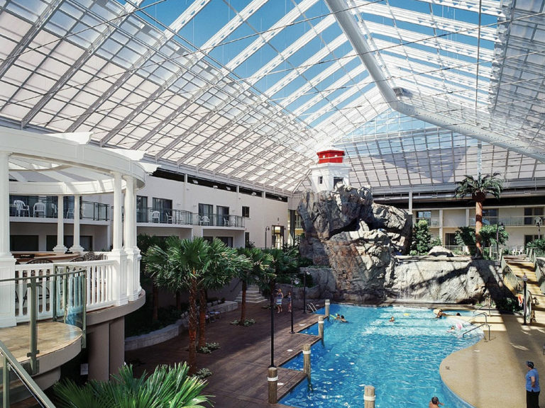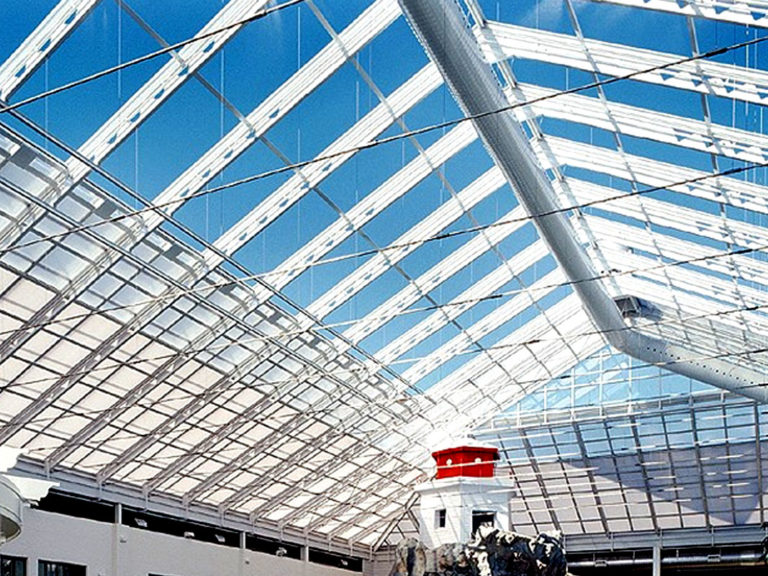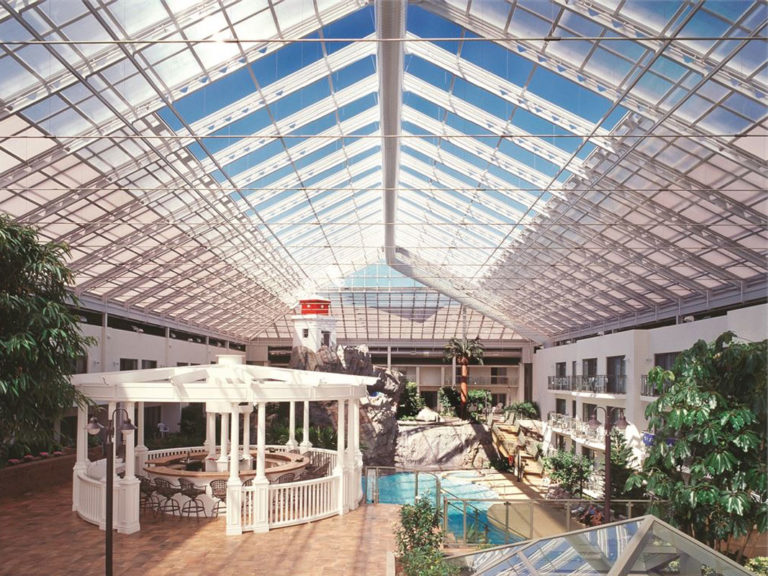 The skylight is 101’-2″x223’-4″ and has 24 opening roof panels in 12 Bays. The rest of the roof is fixed. The entire roof is glazed with 1″ (25mm) polycarbonate. The operable panels and fixed central portion of the roof utilize clear polycarbonate while the fixed roof below is glazed with Opal (white translucent) polycarbonate. One end of the skylight has a Bermuda Hip with a small upper gable end glazed with 1″ (25mm) insulating glass. The other end of the skylight, at the front of the hotel, has a full upper gable end glazed with 1″ (25mm) insulating glass.