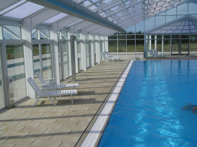 OpenAire has designed and built a bright, beautiful pool enclosure in Denmark. The 59’x82′ enclosure has a radial gazebo end.