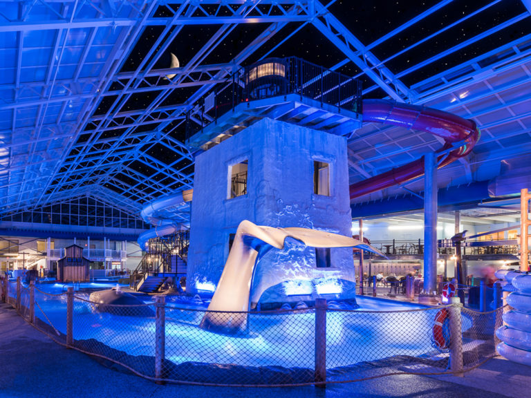 This hotel was previously named, the Cape Codder Resort & Spa. The family-owned seaside resort was renovated by the team at OpenAire with partners Rescom Architectural Inc., East Coast Commercial, and Dodd & Associates Engineering Company in 2014. The 12,240 square-foot, retractable-roofed Cape Codder Waterpark features two body slides, a 300-foot lazy river with waterfalls and rapids, a spray deck for children, and a water-play area for toddlers, all available year-round thanks to an elegant double-sloped retractable skylight designed and installed by OpenAire.