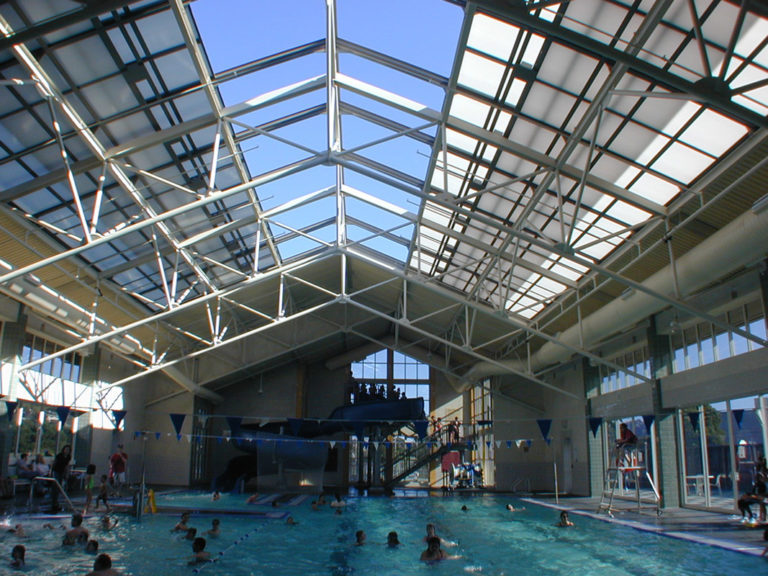 The skylight is glazed with 1″ (25mm) polycarbonate in 6 bays with 12 operable roof panels. OpenAire’s thermally broken aluminum frame sits on the building’s steel super-structure. The skylight measures 59’x50′.
