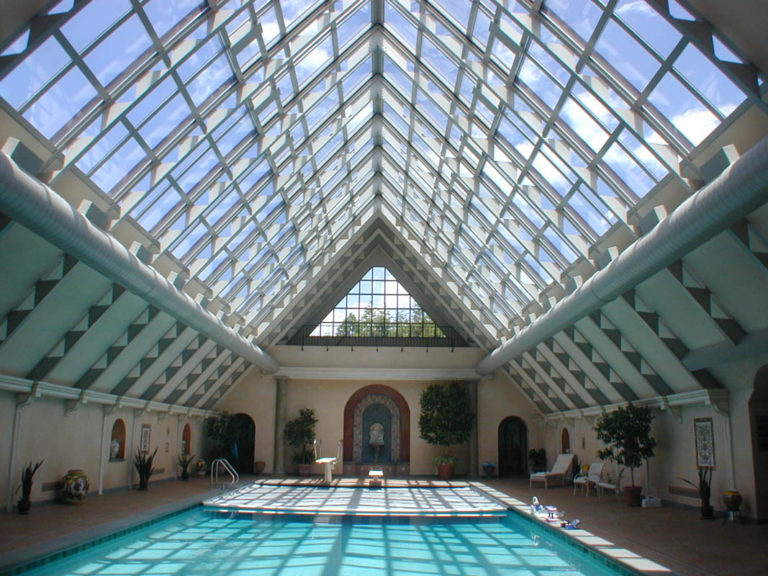 This extraordinary residential pool enclosure combines the elegance of traditional materials with the benefits of modern technology. With field stone side walls and slate roofing the enclosure blends perfectly with it’s surroundings. The steep roof pitch (12/12), slate roofing and glass skylight create a striking building whether viewed from the exterior or interior.