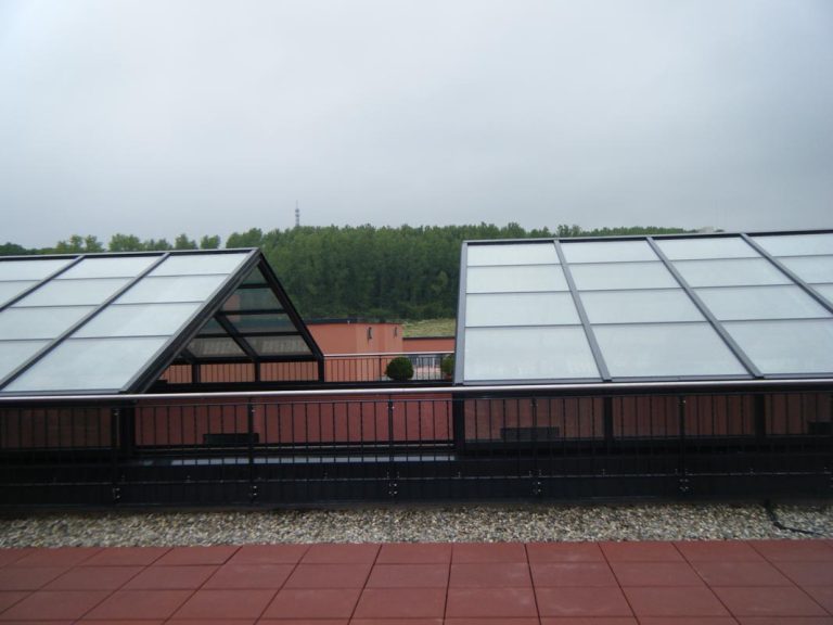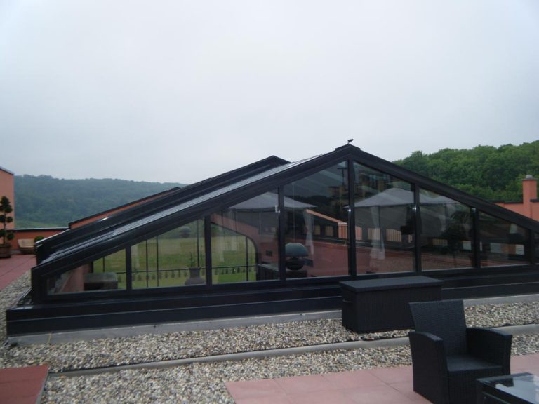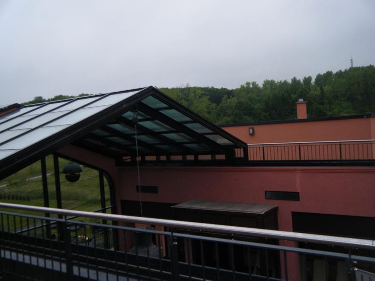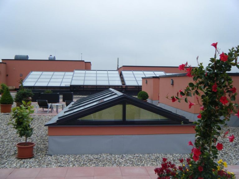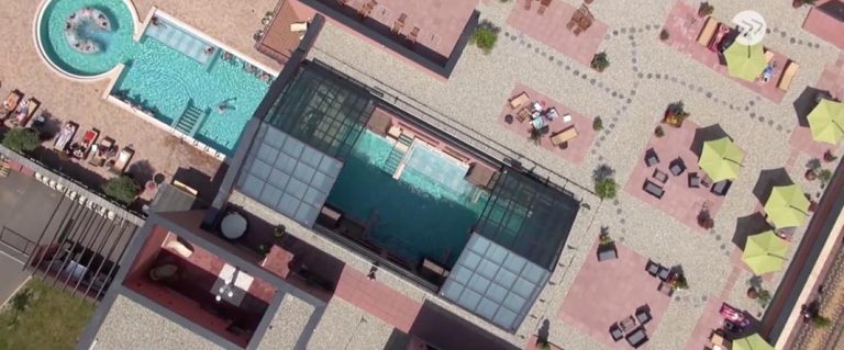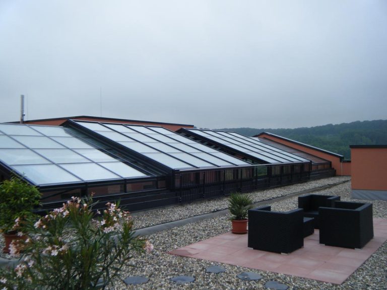 The large thermal hall is crowned by a retractable glass roof. The roof opens in the middle and bi-parts with the two halves moving in opposite direction. As with all spaces including a retractable roof, the main hall with the open roof is a key feature in the design of the facility.