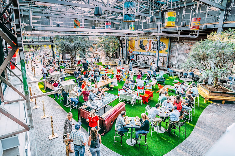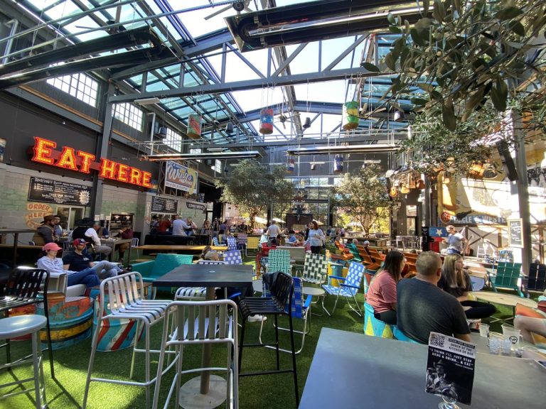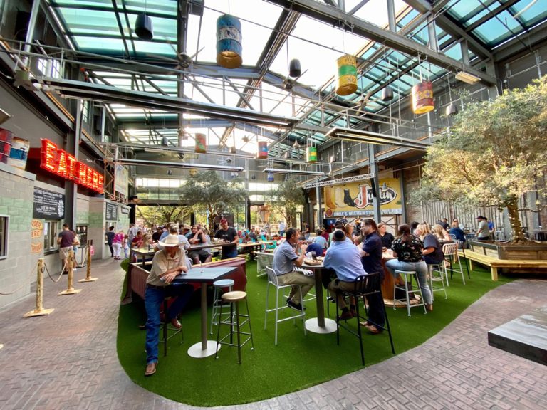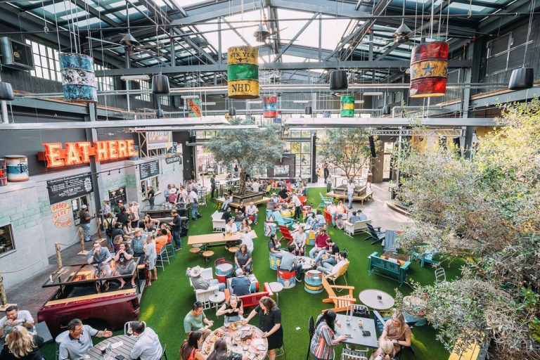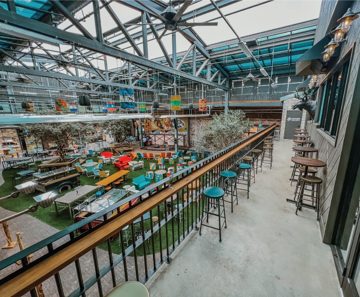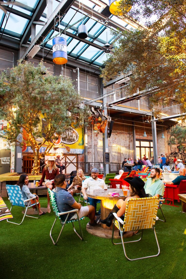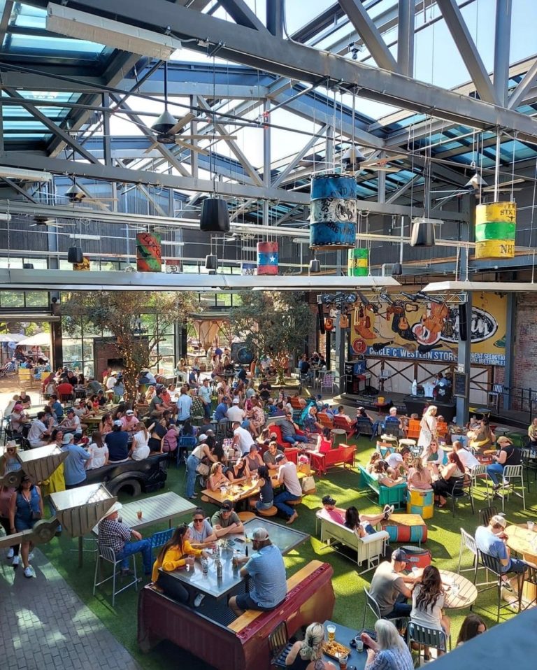 Second Rodeo Brewing is “a backyard bar with chef-driven grub, live music and outdoor games for the whole family.” The 60ft x 90 ft retractable roof skylight opens from the top down and sits on top of the existing steel and stone buildings. The venue features sunshine, fresh air, games, music casual vibes and is a fabulous rentable event venue.