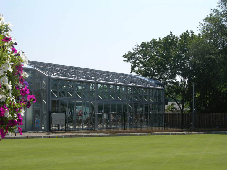 The enclosure is a beautiful, modern shape that enhances the traditional look of the mid-century flat-roofed structure around it. The curved roof bends gently towards a clear glass wall, creating an elegant space while enhancing the image of one of Toronto’s most popular private clubs.