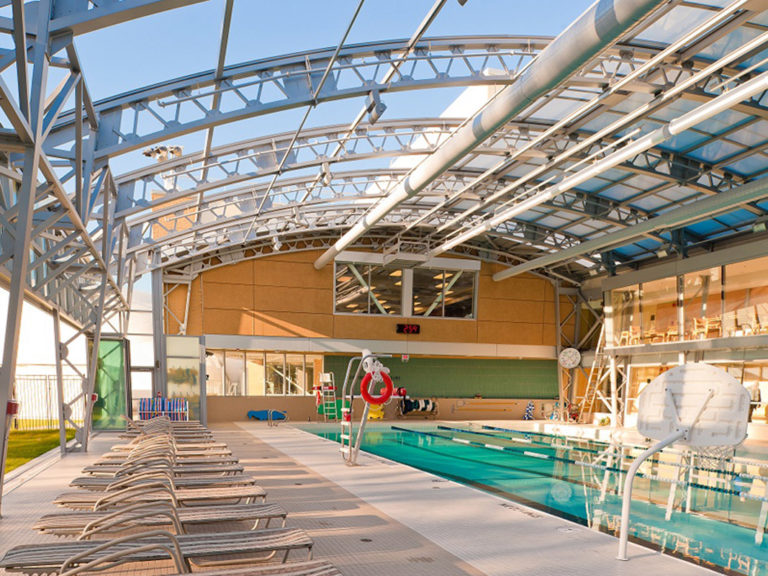 Partnering with Toronto’s McCormack Architects, OpenAire created an elegant solution that would please everyone. OpenAire worked closely with the architectural firm to design, manufacture and install a unique retractable pool enclosure that literally turns the indoor pool into an outdoor one whenever the weather allows.