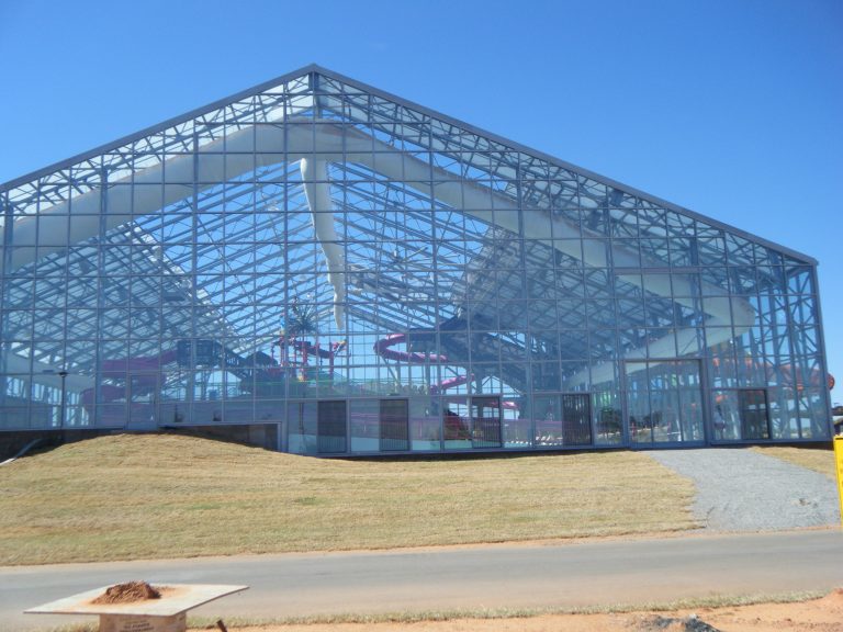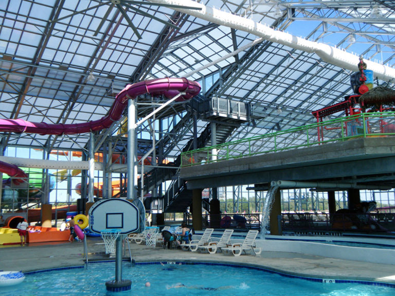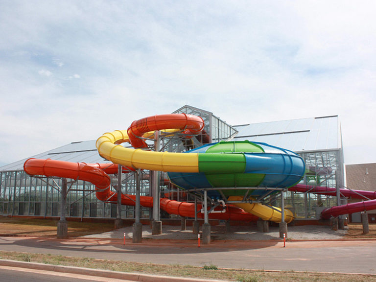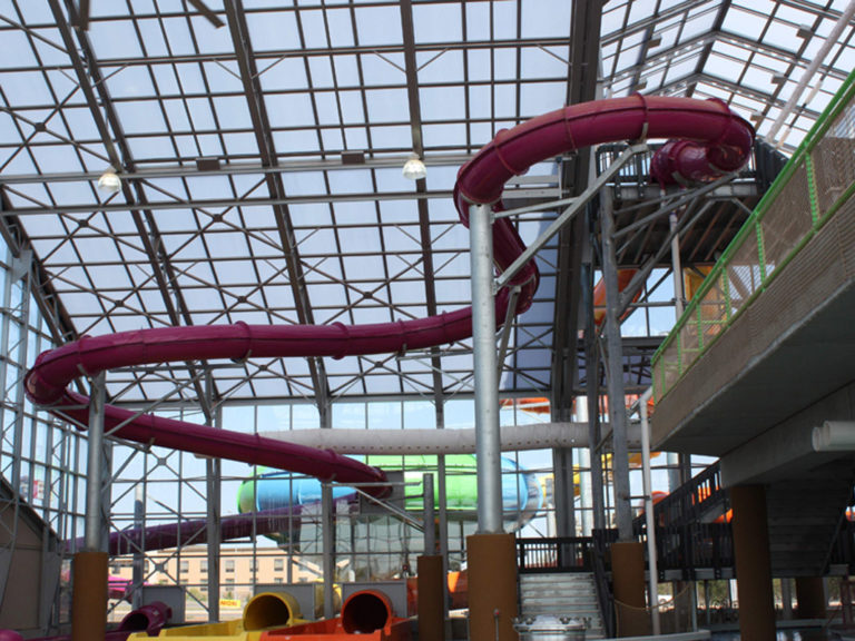Walter Schumacher, the owner, did a tremendous amount of homework and due diligence, and chose an operable OpenAire solution because of its unique appeal. Water-Zoo Indoor Waterpark, the first indoor water park in Clinton, opened its 132’ (40.2m) x 184’ (56.1m) OpenAire retractable roof enclosure in September 2012. Complete with a mezzanine-level playground, the 28,000 square foot Water-Zoo Indoor Waterpark can open its roof when the weather is warm enough, so Clinton residents will feel fresh air flooding the building. Humidity is naturally exhausted through the opening; therefore, dehumidification systems can be turned off, which saves energy. And the polycarbonate roof and insulated glass enclosure lets in plenty of sunlight, which saves on lighting as well. During the winter months when the roof is closed solar gain naturally warms the enclosure offsetting some e of the heating requirements. The glass enclosed water park is climate controlled for patrons to enjoy 80 degree temperature year round.